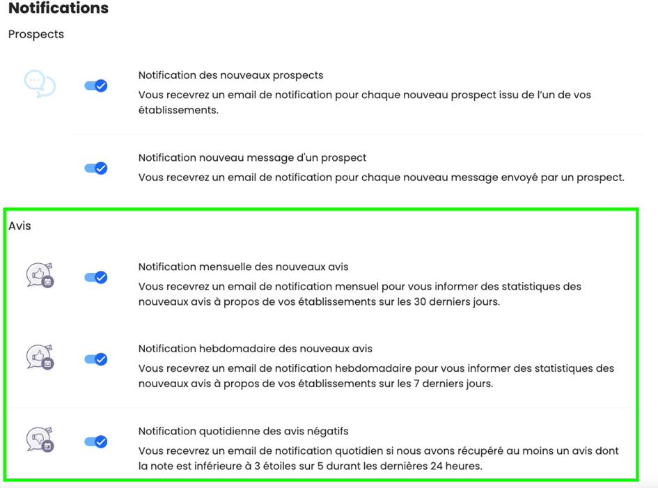 Que vous soyez Administrateur, Gestionnaire d’établissement ou Gestionnaire de groupe, si vous avez accès à la rubrique « Avis » dans votre interface, vous pouvez facilement activer ou désactiver ces notifications pour mieux répondre aux besoins spécifiques de votre réseau.